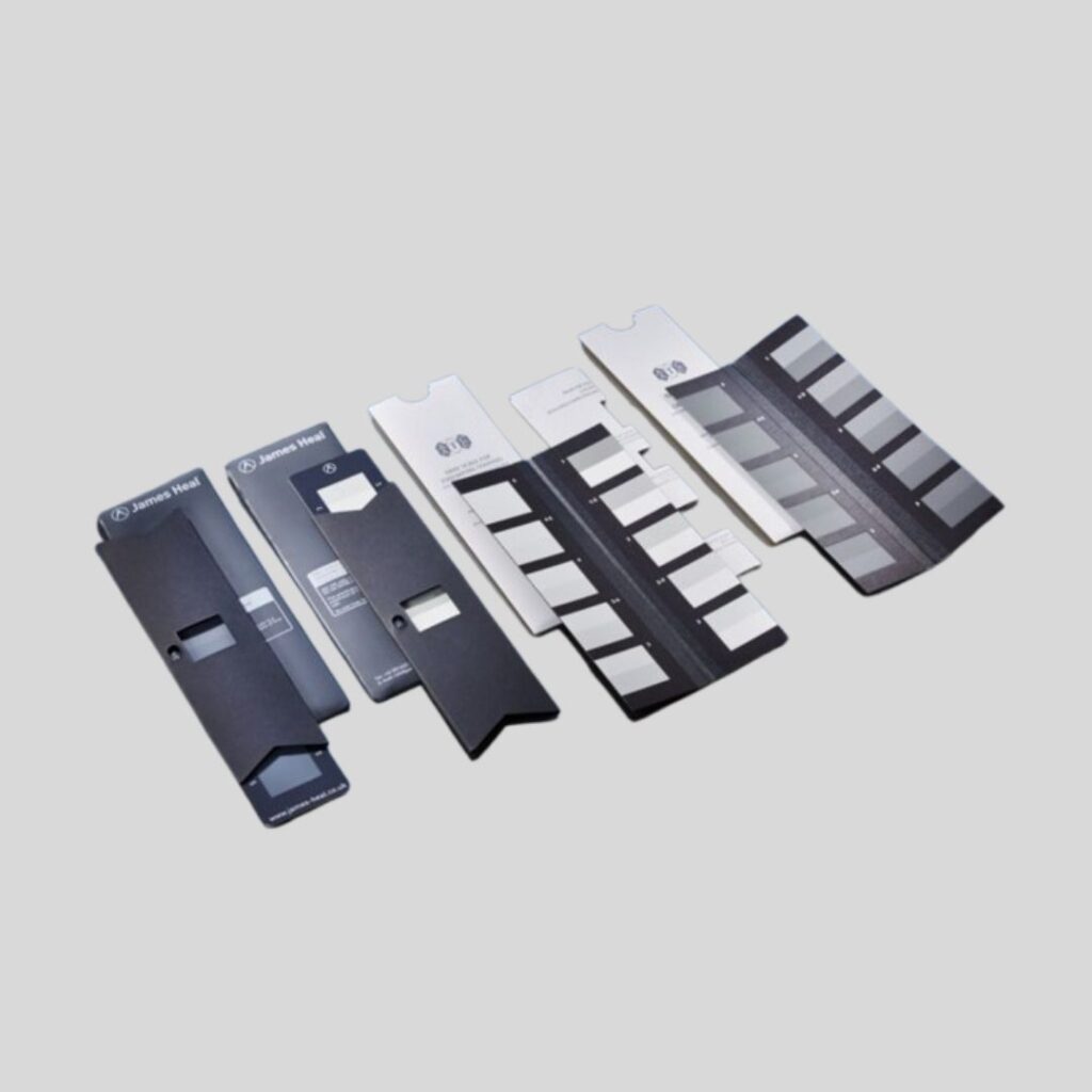 For assessment of change in colour and staining in colour fastness testing 1-5 steps with half steps.
